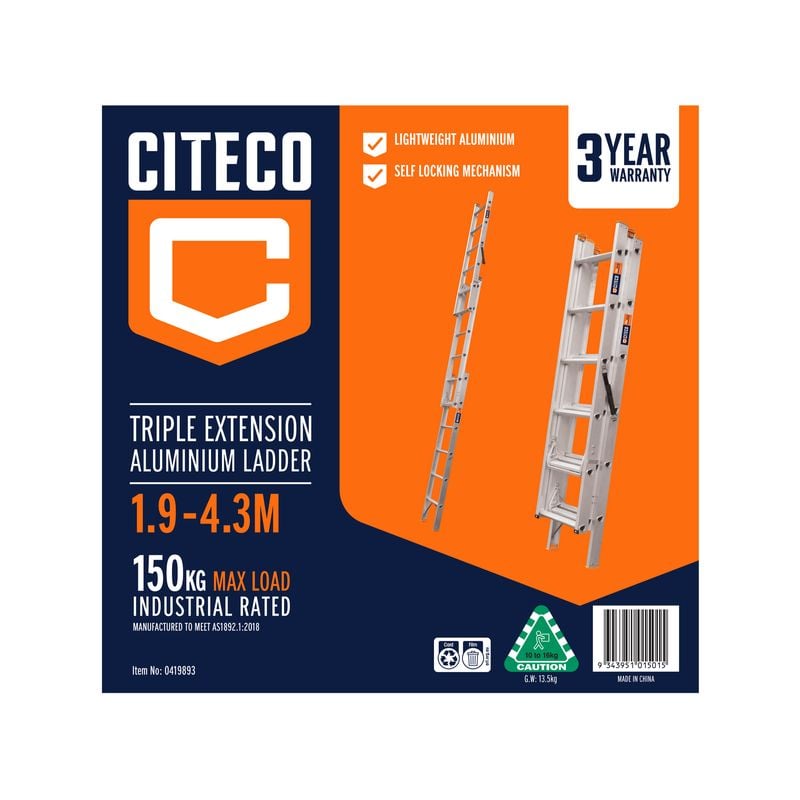 Citeco1.9 - 4.3m 150kg Industrial Triple Extension Aluminium Ladder