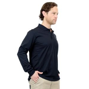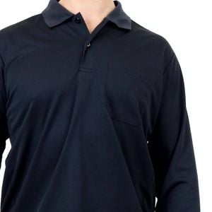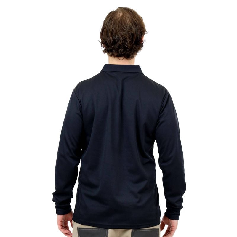 Long sleeve, button up polo features a ribbed collar and chest pocket. Lightweight with sports mesh side panels to keep you cool