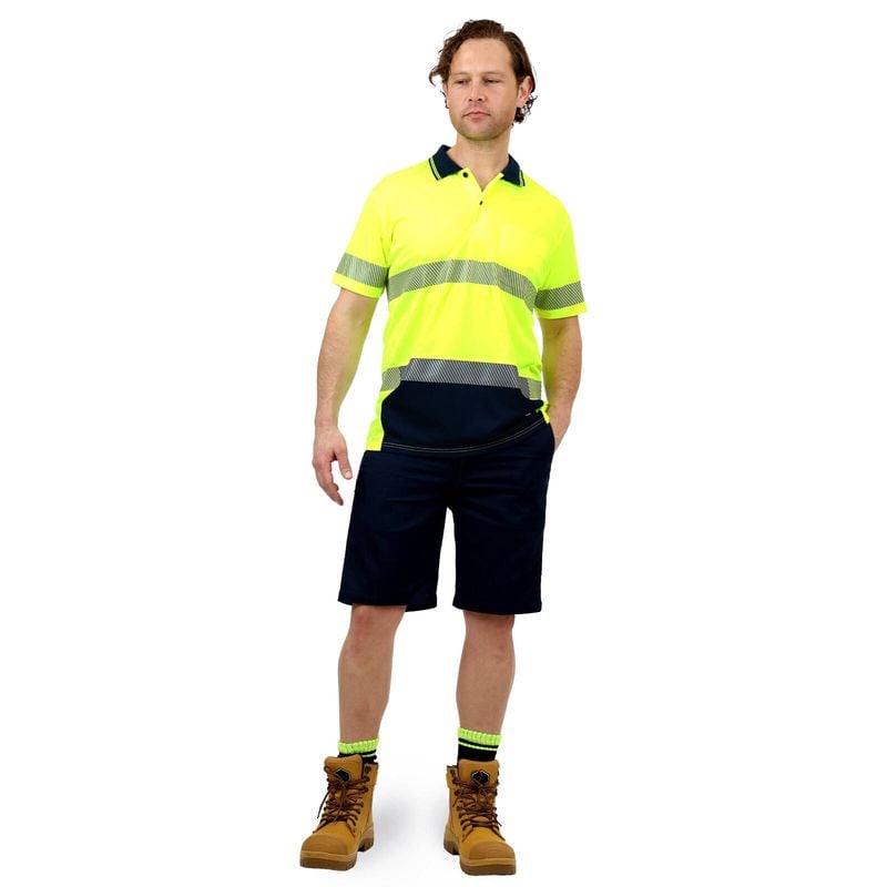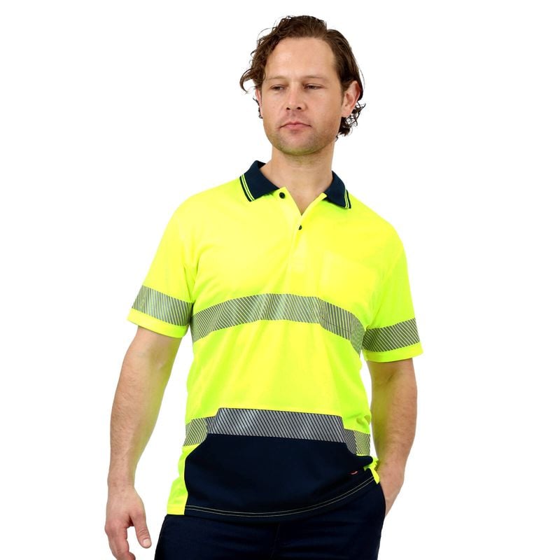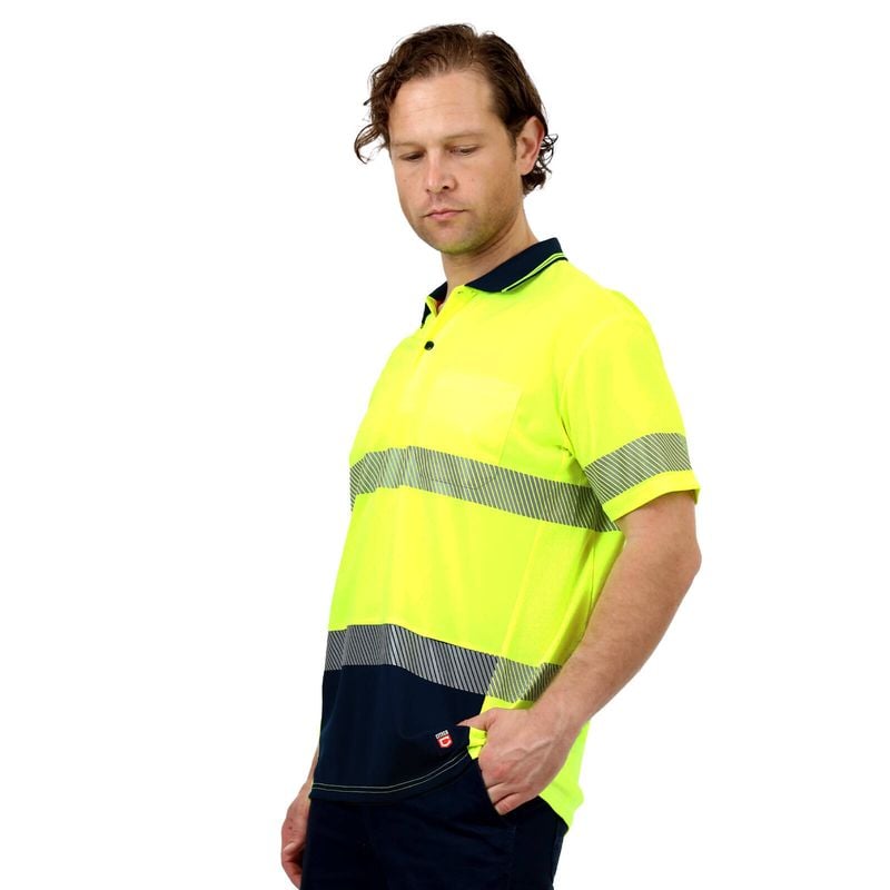 Hi-Vis short sleeve, button up polo features a ribbed collar and chest pocket. Hi-vis with reflective tape making it suitable for Day/Night use. Lightweight with sports mesh side panels to keep you cool