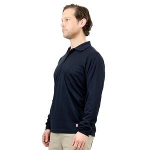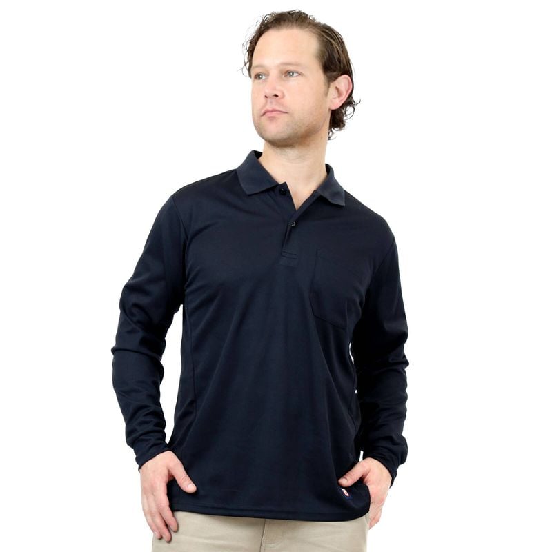 Long sleeve, button up polo features a ribbed collar and chest pocket. Lightweight with sports mesh side panels to keep you cool