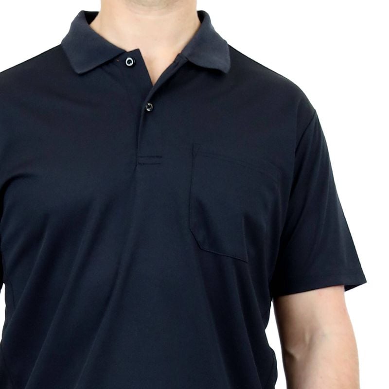 Short sleeve, button up polo features a ribbed collar and chest pocket. Lightweight with sports mesh side panels to keep you cool