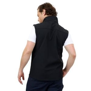 Black vest with soft shell outer and fleece lining . The vest fully zips up, features a chest pocket and two front fleece lined pockets.