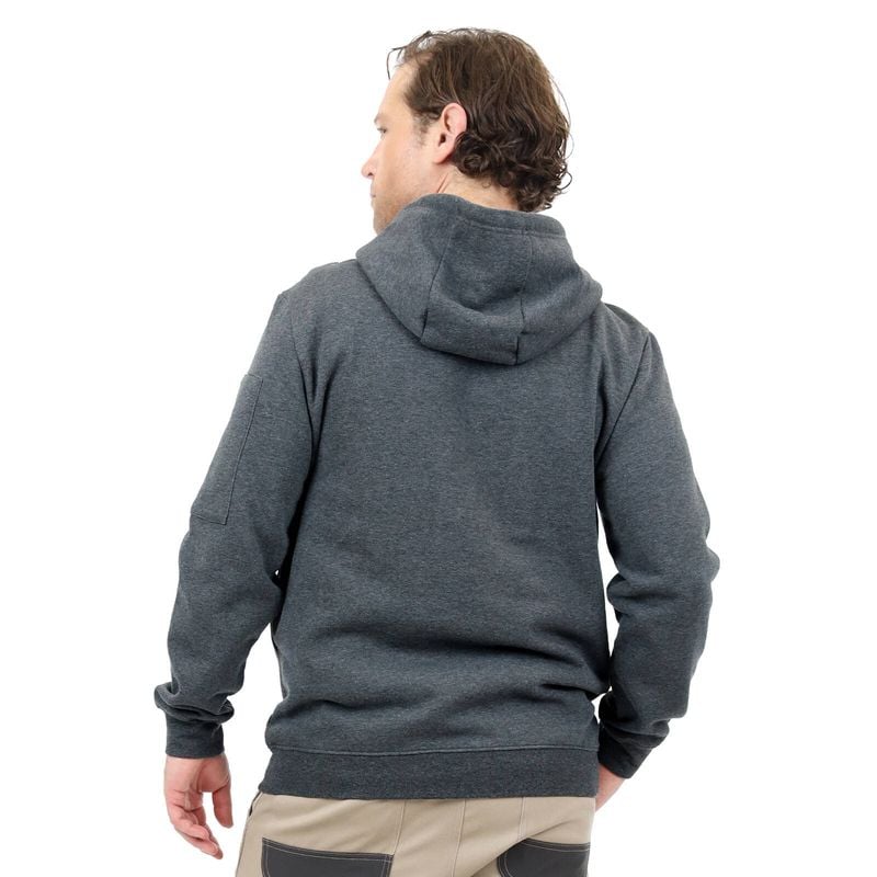 The work hoodie is made with a soft brush back fleece and features front kangaroo pocket with an internal pocket and a sleeve patch pocket.