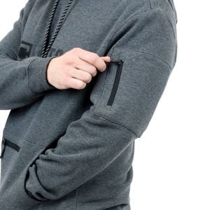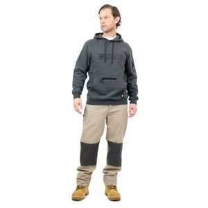 The work hoodie is made with a soft brush back fleece and features front kangaroo pocket with an internal pocket and a sleeve patch pocket.