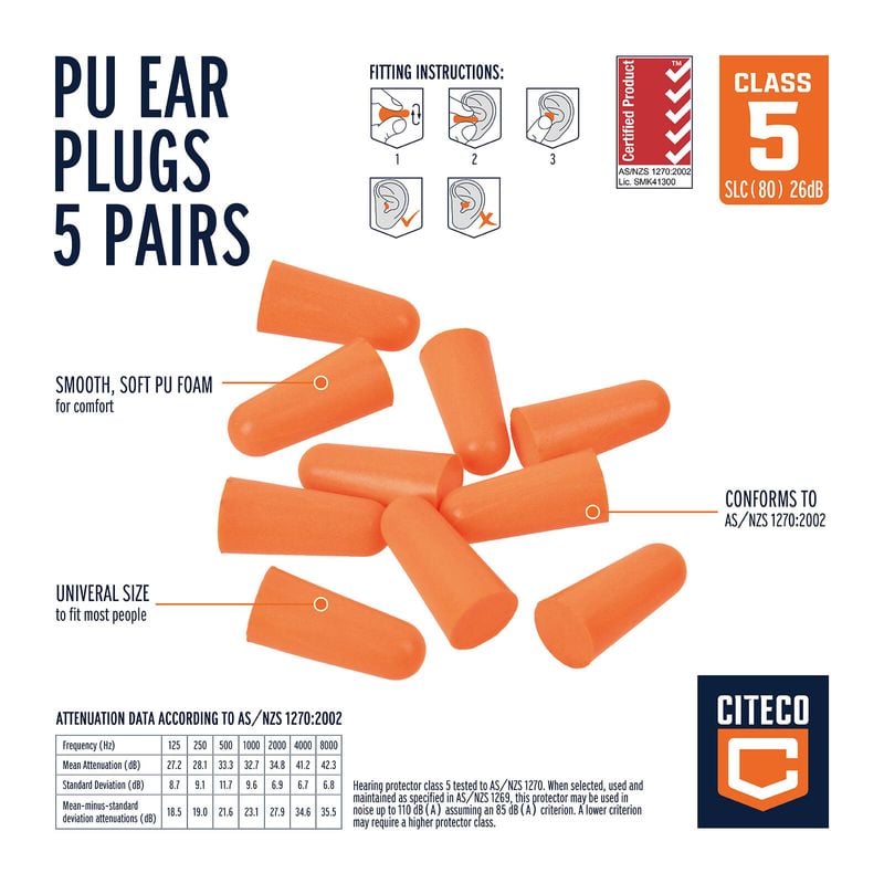 The CITECO Ear Plugs Class 5 are a convenient way to protect your hearing. The taper fit design provides comfort when working. These earplugs are ideal for noise intense activities and around the home.